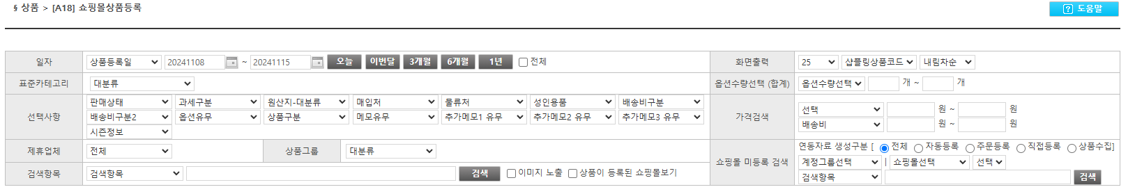 - 상품 등록 혹은 수정 페이지에서 쇼핑몰별 [항목] 등록 버튼을 통해 입력이 가능한 항목들 입니다.