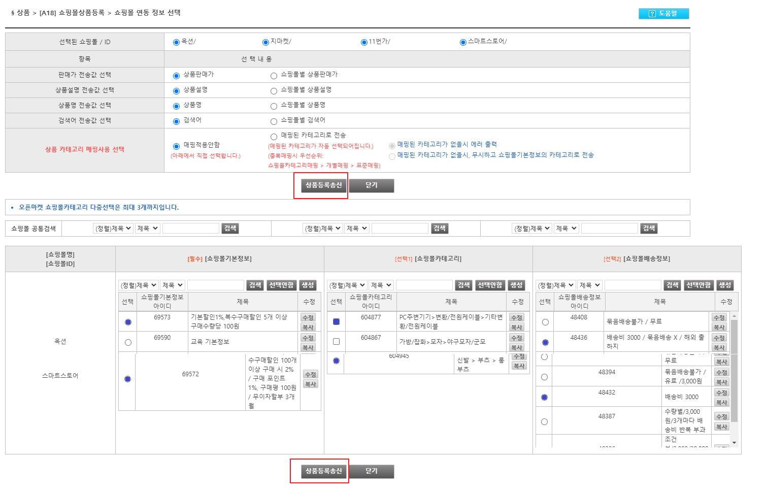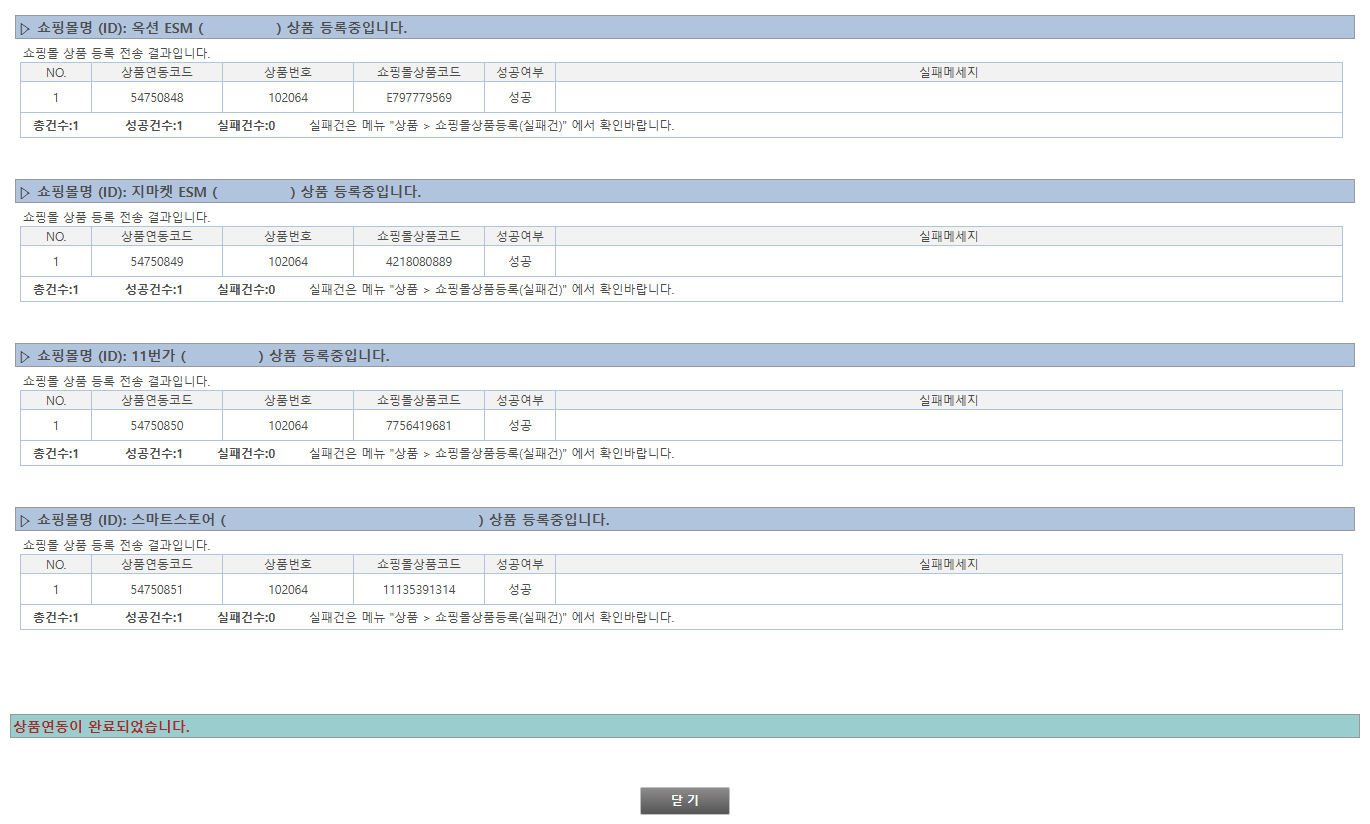 - 어느 위치에 있는 상품등록송신 버튼을 눌러도 정상적으로 등록전송이 진행됩니다.