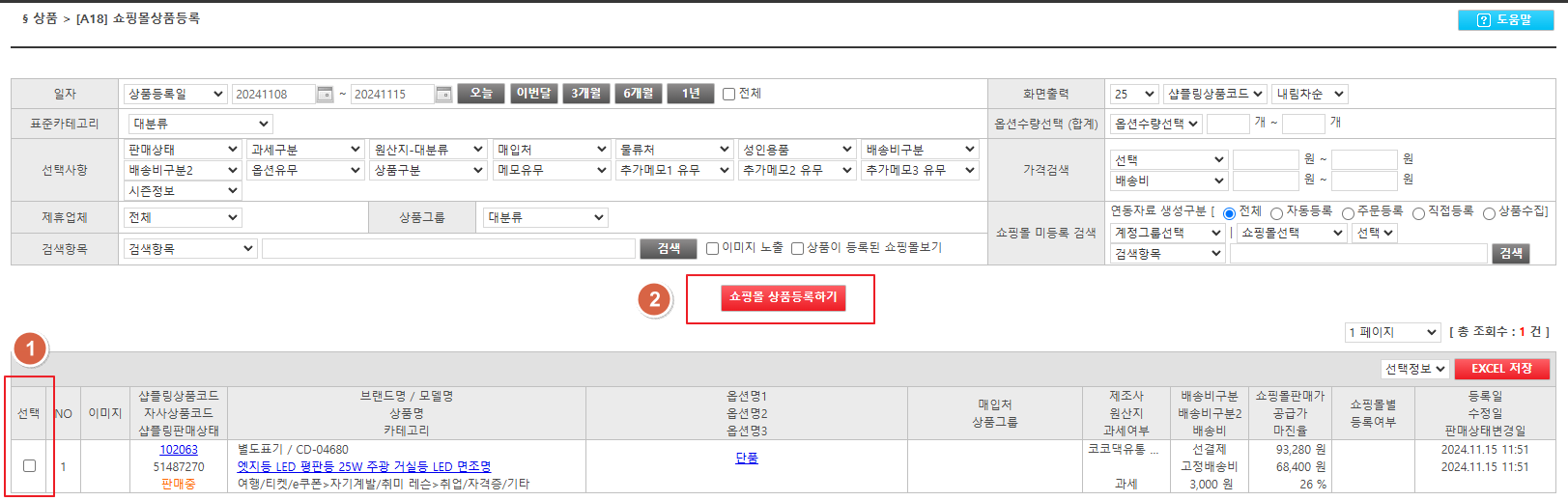 - 검색된 상품을 건별, 대량 등록전송 할 수 있습니다.