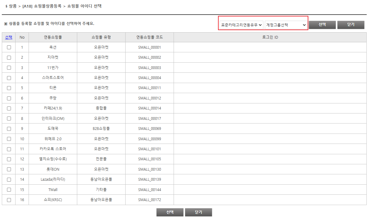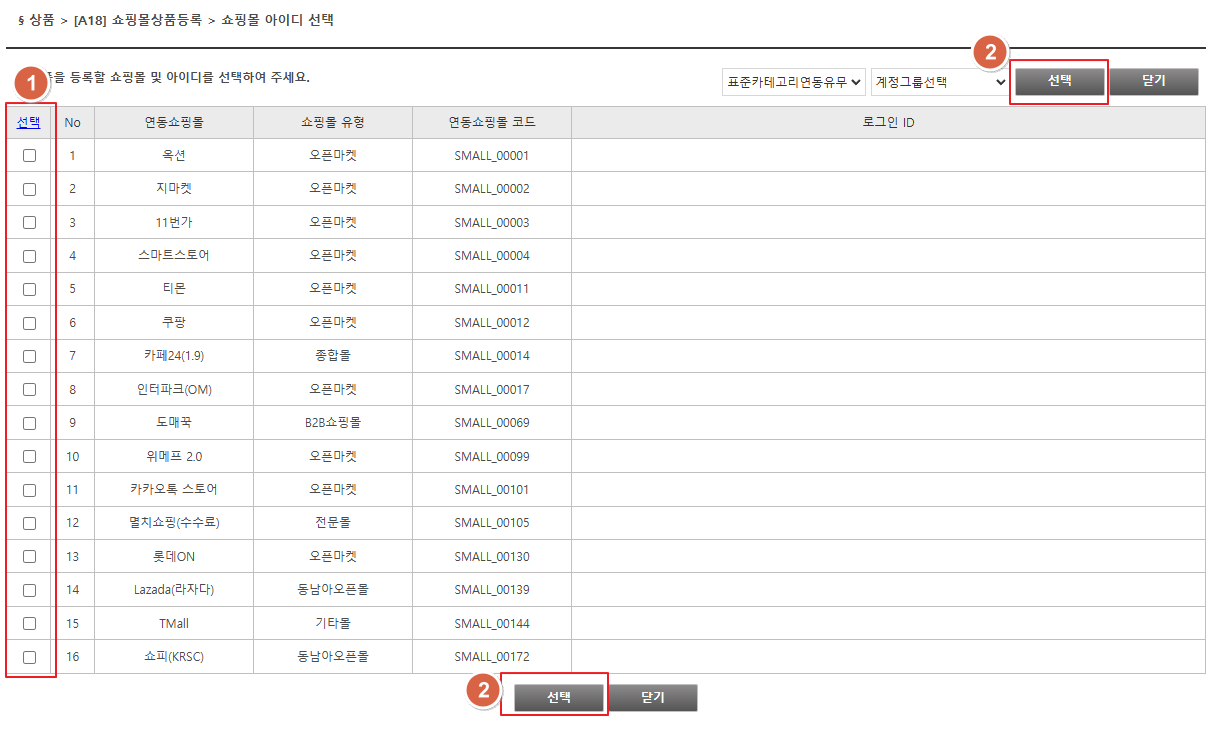 4. 선택 : 쇼핑몰선택에서 선택한 쇼핑몰의 F1에서 입력한 ID를 선택 할 수 있습니다.