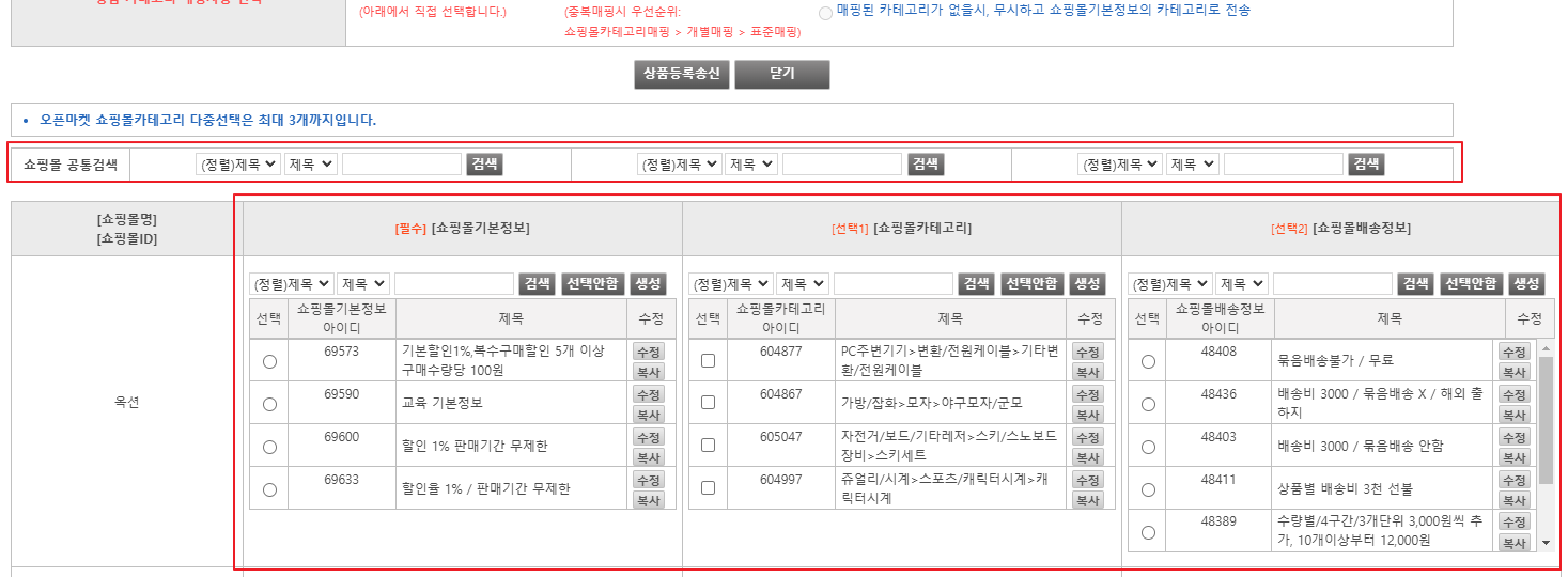 ※ 쇼핑몰카테고리를 먼저 선택하고, 매핑된 카테고리로 전송을 선택하여도, 이미 선택된 쇼핑몰카테고리는 선택이 되지 않은 것으로 처리됩니다.