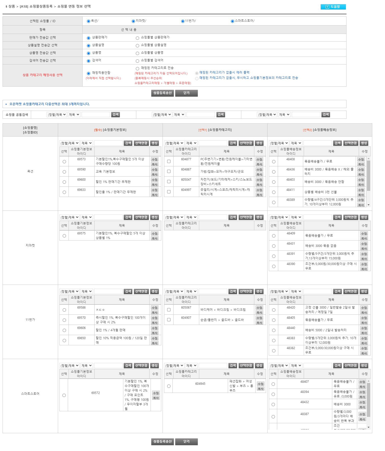 - 해당 항목에서 검색시 전 화면에서 선택하신 모든 쇼핑몰의 ID의 쇼핑몰기본정보와 쇼핑몰카테고리, 쇼핑몰배송정보를 한번에 검색할 수 있습니다.