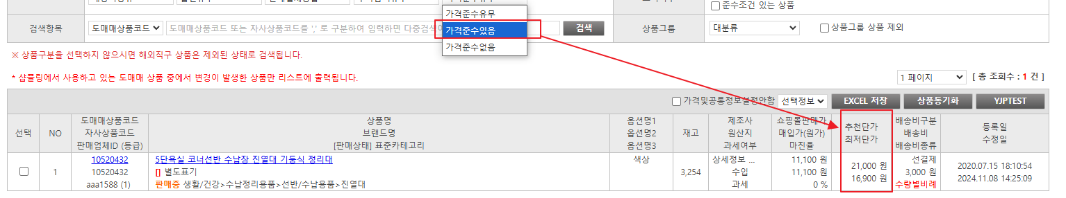 - 판매가변경함 : 하단에 설정한 마진율, 수수료율 등을 통해 변경된 제휴업체 판매가를 기준으로 계산하여 변경하게 됩니다.