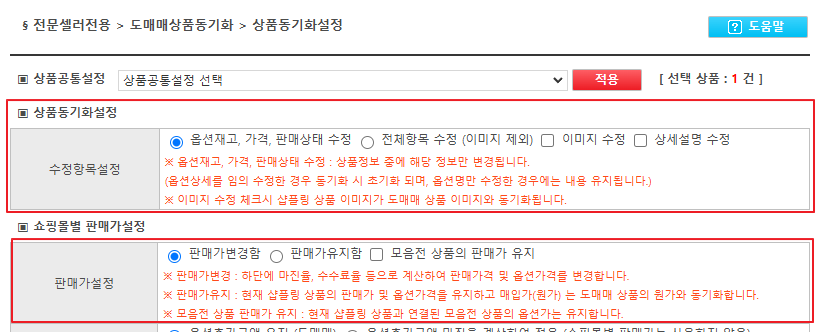 ※ 상품은 마진/ 수수료율 설정값, 배송비, 배송비구분 등의 구분이 공통설정 되는 상품끼리 동기화 해주셔야 합니다.